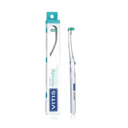 El cepillo Vitis Monotip Unipenacho está diseñado con un solo penacho de cerdas para limpiar áreas específicas de difícil acceso, como márgenes gingivales, implantes, aparatos de ortodoncia o dientes aislados. Sus cerdas suaves permiten una limpieza localizada sin dañar encías ni esmalte. Es ideal como complemento del cepillado habitual, asegurando higiene en zonas donde los cepillos convencionales no llegan. Su mango ergonómico ofrece precisión en la técnica de cepillado. Recomendado por odontólogos en tratamientos especializados.