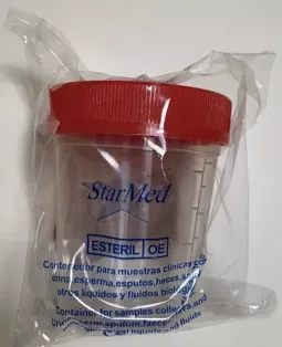 El frasco de orina estéril es un envase médico diseñado para la recolección de muestras de orina en condiciones seguras e higiénicas. Fabricado en material plástico estéril, cuenta con tapa hermética que evita derrames y contaminación externa. Es utilizado en exámenes de laboratorio para diagnósticos clínicos, como análisis de infecciones urinarias, controles de glucosa, proteínas o exámenes de rutina. Su esterilidad garantiza resultados confiables al evitar la alteración de la muestra. Está indicado tanto para uso hospitalario como en laboratorios y consultas médicas.